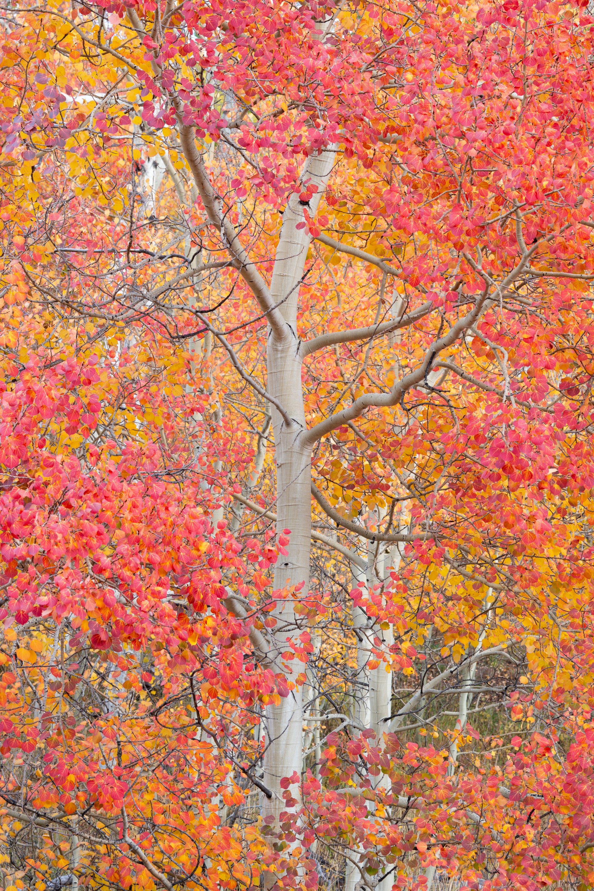 This image is simple. It is simple but it is so beautiful. The softness of the trunk and the way it delicately moves as if it’s dancing. Surrounded by the fiery red leaves and the soft purples and oranges in the background. This small scene amongst so many vivid aspens drew me in and I knew I had to shoot this large expanse of stunning aspens small and intimate.