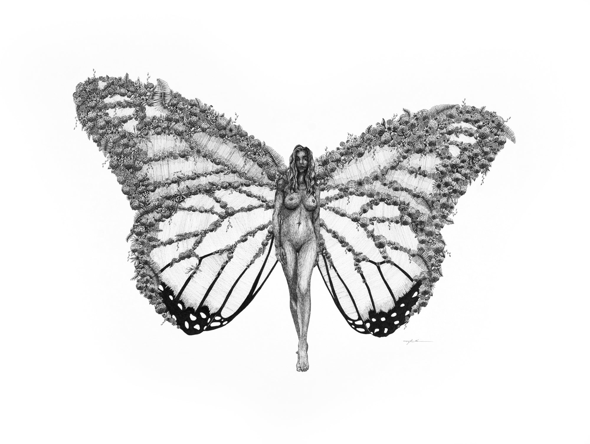 Representing the beauty and power of the woman, Rebirth was drawn with butterfly wings changing into elaborate floral displays.  Beautiful, strong, delicate, and powerful; Rebirth symbolizes the balance of all of these both in nature and femininity.