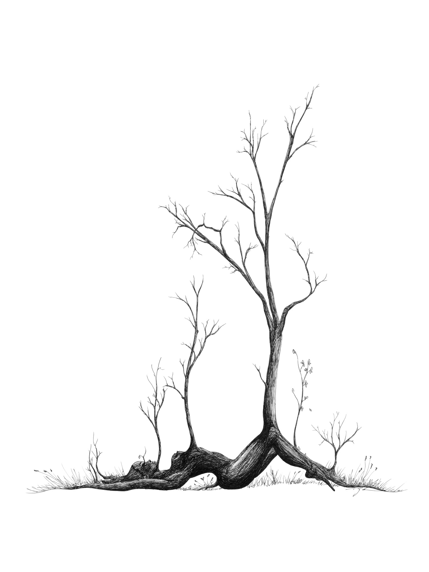 A woman lies on the ground as her body is taken by the earth and transformed into nature.